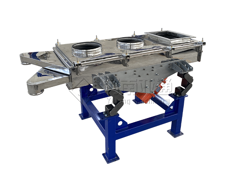 直线振动筛(直线筛)利用振动电机激振作为振动源,使物料在筛网上被抛起,同时向前作直线运动,物料从给料机均匀地进入筛分机的进料口,通过多层筛网产生数种规格的筛上物、筛下物,分别从各自的出口排出。具有耗能低、产量高、结构简单、易维修、全封闭结构,无粉尘溢散,自动排料,更适合于流水线作业。